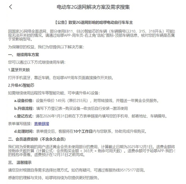 为保障正常使用,哈啰提供蓝牙开关锁方案,或申请149元升级4G智能芯(原价255元),含转接线及一年黄金会员。登记需在2026年1月31日前完成,客服将在10个工作日内联系处理。此外,未使用的黄金会员费用将按剩余天数折算退款,预计12月31日前到账。