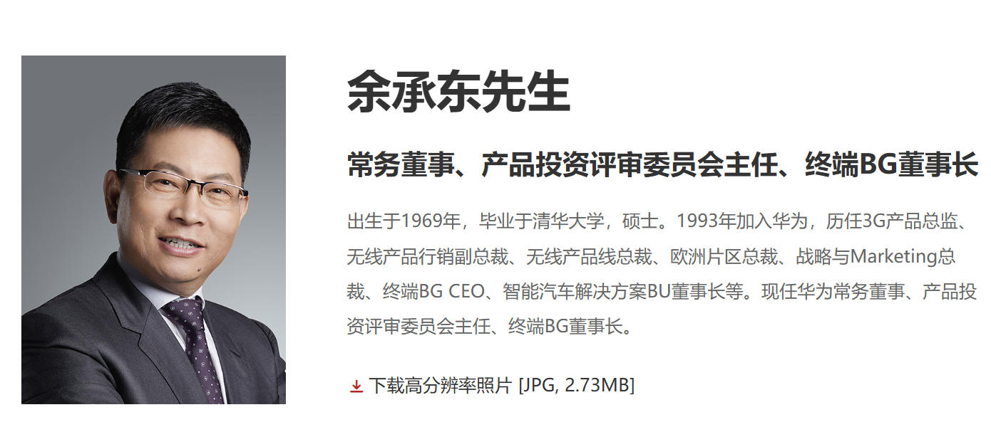 根据华为官网信息,余承东出生于1969年,毕业于清华大学,硕士。1993年加入华为,历任3G产品总监、无线产品行销副总裁、无线产品线总裁、欧洲片区总裁、战略与Marketing总裁、终端BG CEO、智能汽车解决方案BU董事长等。现任华为常务董事、产品投资评审委员会主任、终端BG董事长。