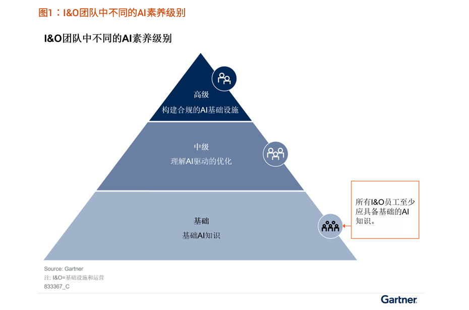 I&O 员工的 AI 素养水平因其在支持、部署或管理 AI 技术及应用方面的具体职责而异,可划分三个级别(见图 1 )。