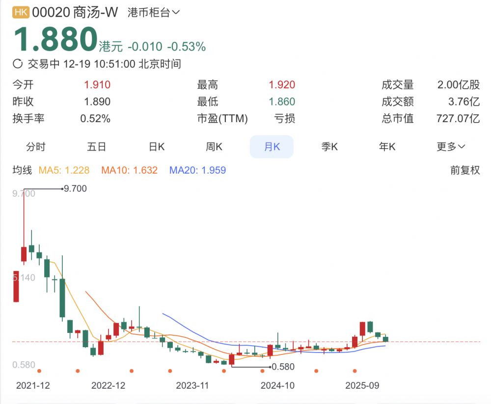 资料显示,作为“AI四小龙”之一,商汤科技于2021年12月30日在港交所上市,创下当时全球AI领域最大IPO成绩单,当日市值一度突破1400亿港元,此后一个月最高涨超3700亿港元。截止发稿,商汤科技市值仅为727亿港元,相比最高点暴跌80%。
