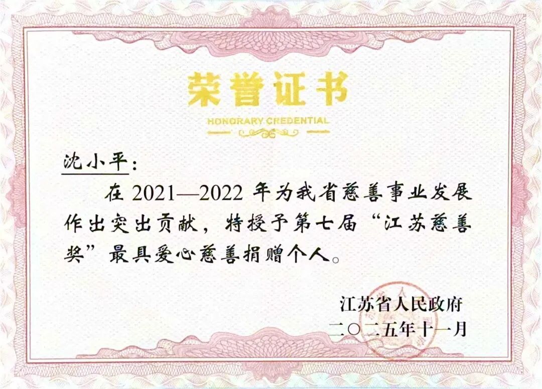 沈小平表示,此次再获江苏慈善奖,是荣誉更是鞭策。站在新的起点,将以更高站位、更实举措、更大力度践行社会责任,在践行慈善使命上彰显新担当、在助力共同富裕上展现新作为、在营造慈善生态上作出新贡献,让“人人心怀慈善、人人参与慈善”成为社会新风尚,为江苏慈善事业高质量发展注入更强动力。