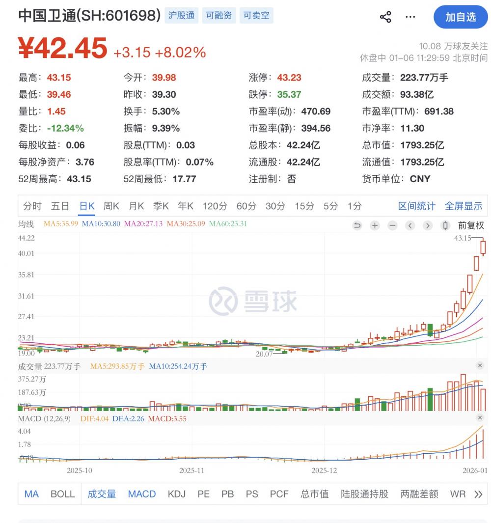 截至2026年1月6日午间收盘,中国卫通股价报42.45元,当日涨幅达8.02%,对应总市值约1793.25亿元。这一市值已超过中国联通(1622.62亿元),使中国卫通成功跻身国内基础电信运营领域的市值前三行列。