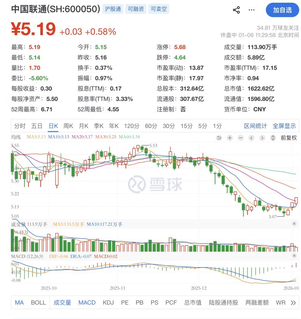 中国联通前三季度营业总收入2929.85亿元,同比增长 0.99%(连续5年上涨);归母净利润 87.72亿元,同比增长5.20%(同样连续5年上涨),基本面稳健。