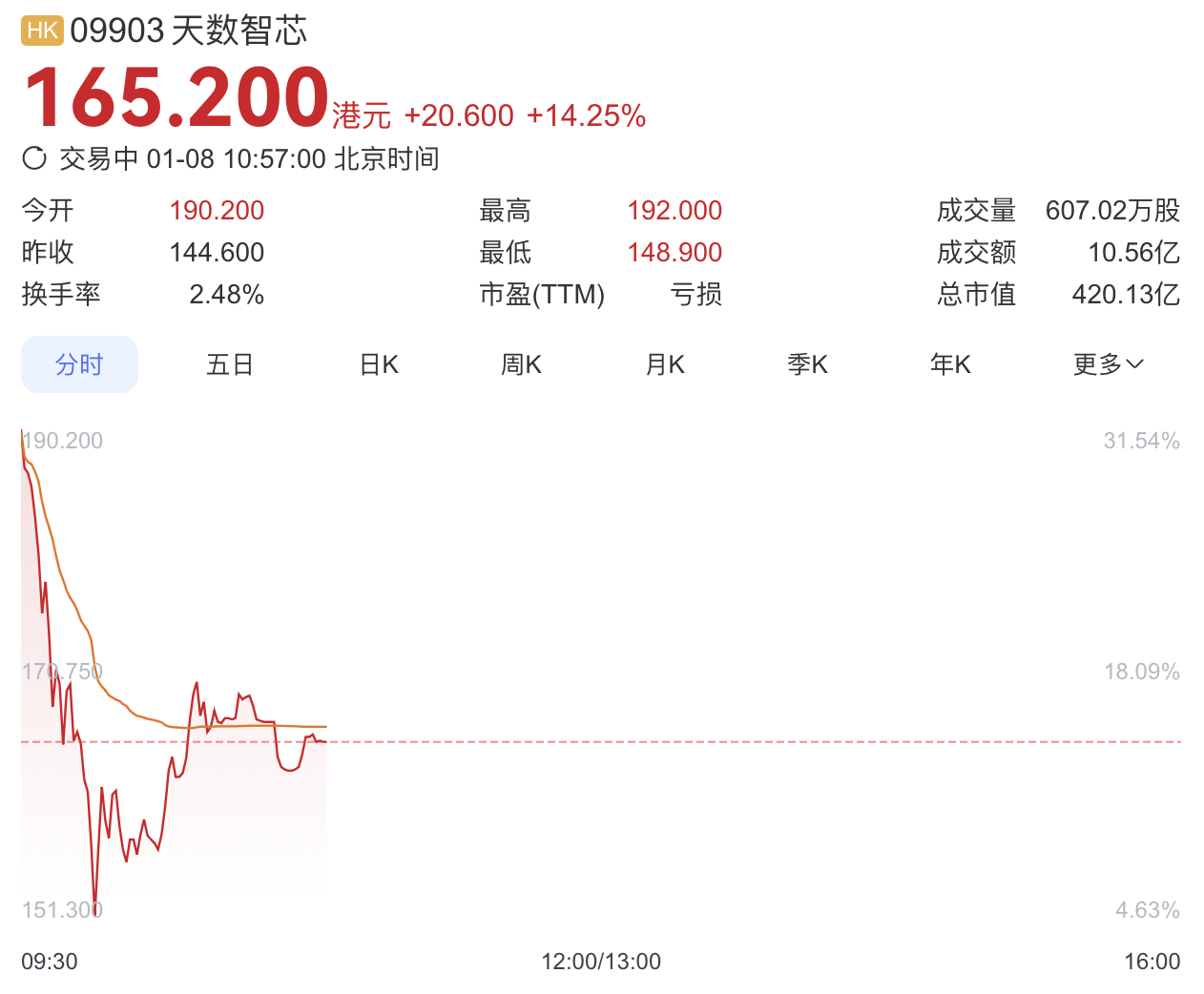 天数智芯发行价定为144.6港元,募资规模约37亿港元。上市首日,天数智芯开盘暴涨31.54%,达到了190.20港元/股,市值突破475.5亿港元。截止发稿,天数智芯股价上涨14.25%,总市值420亿港元。
