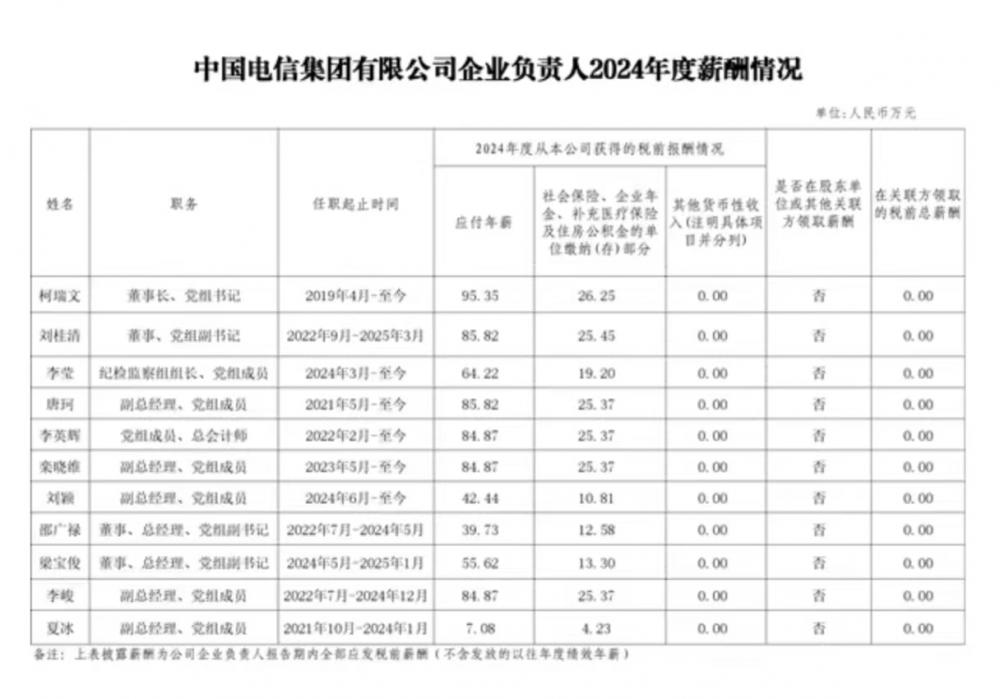 中国电信2024年度应付年薪最高的是董事长、党组书记柯瑞文,为95.35万元。