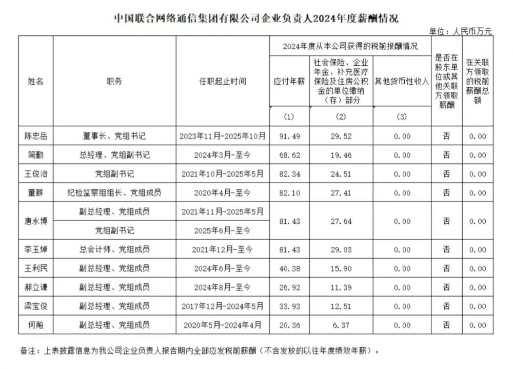 中国联通2024年度应付年薪最高的是时任董事长、党组书记的陈忠岳,为91.49万元(2025年10月调任中国移动董事长)。