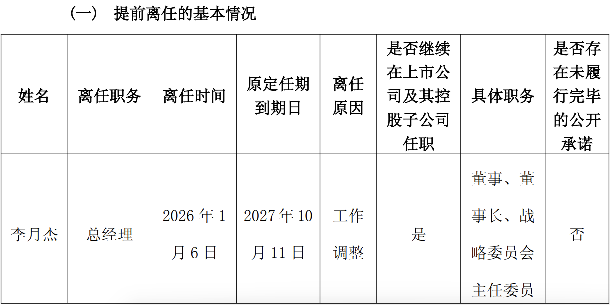 同时,公司于2026年1月12日召开第六届董事会第十次会议,审议通过了《关于变更公司总经理的议案》,经公司董事长李月杰先生提名、董事会提名委员会审核通过,董事会同意聘任韩猛先生为公司总经理,并继续代行公司董事长及法定代表人职责,任期至第六届董事会届满。