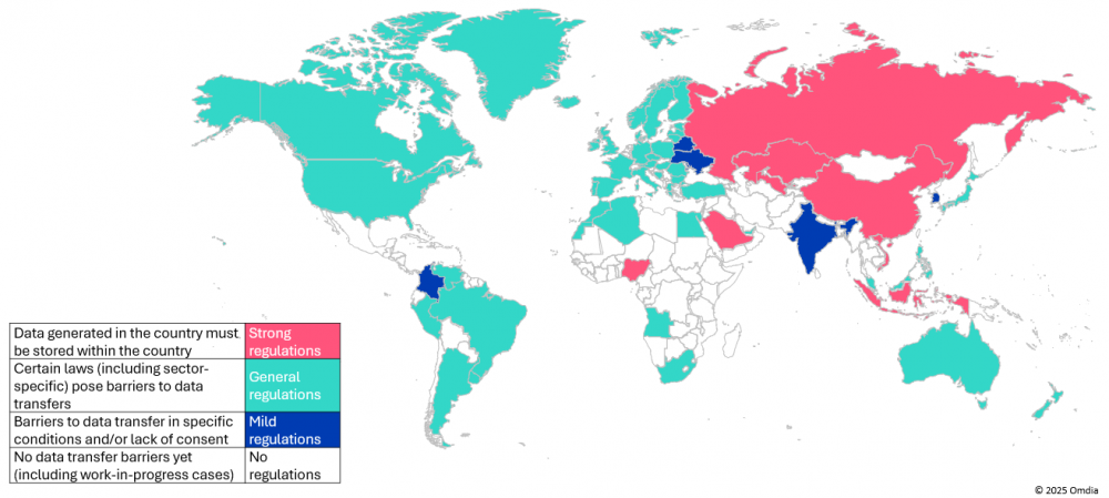 图1:截至2024年1月各国跨境数据传输法律对比。资料来源:Omdia。