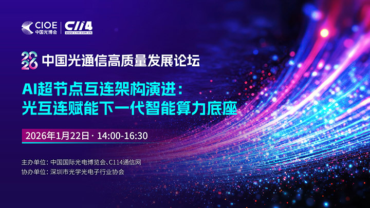 1月22日,CIOE中国光博会与C114联合举办“2026中国光通信高质量发展论坛”线上研讨会——“AI超节点互连架构演进”专场。深入探讨AI驱动下超节点互连架构的演进趋势,聚焦光互连在高性能AI集群中的可行性与落地路径,推动“以网强算、以光赋智”理念在算力基础设施中的实践落地。