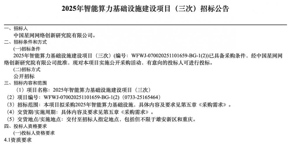 C114讯 1月23日消息(苡臻)2026年1月21日,中国星网网络创新研究院有限公司发布2025年智能算力基础设施建设项目(三次)招标公告。