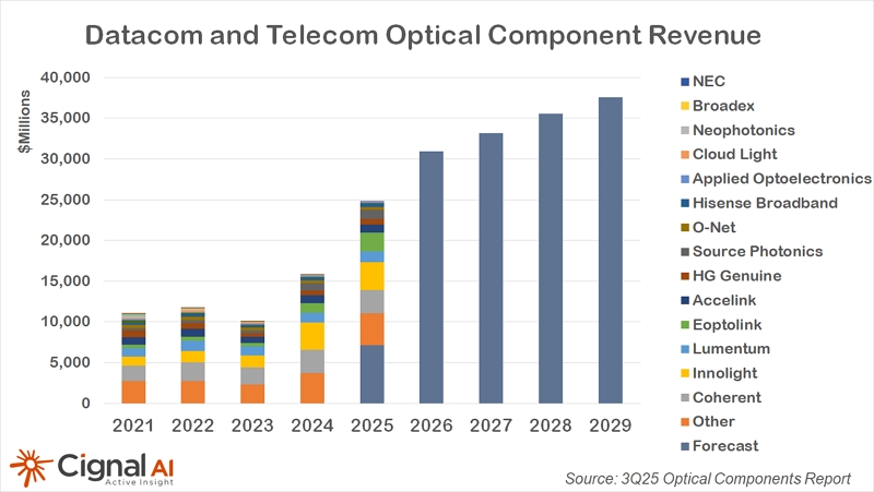 C114讯 1月26日消息(水易)近日,市场研究机构Cignal AI在最新报告中表示,受人工智能驱动的数据中心和传输网络建设推动,2025年光器件市场营收将创历史新高。其中,数通板块的营收预计将超过180亿美元,相干光模块营收则将达到近60亿美元。