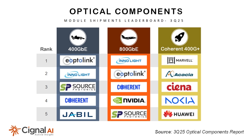 “2025年第三季度,400G及以上速率的数通光模块出货量首次突破1000万只,营收超过50亿美元。”Cignal AI首席分析师 Dr. Scott T. Wilkinson表示,下一阶段的增长引擎将是1.6T光模块和用于多场景扩展的相干光模块,目前Ciena、思科/Acacia和诺基亚已开始向Meta等客户交付800ZR+模块。