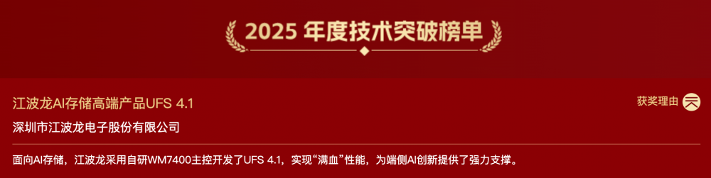 日前,2025年度AI+“硬核”榜单正式揭晓,深圳市江波龙电子股份有限公司(以下简称“江波龙”)凭借其自主研发的AI存储高端产品UFS4.1成功入选“2025年度技术突破榜单”,彰显其在端侧AI存储领域的卓越创新能力与行业领先地位。