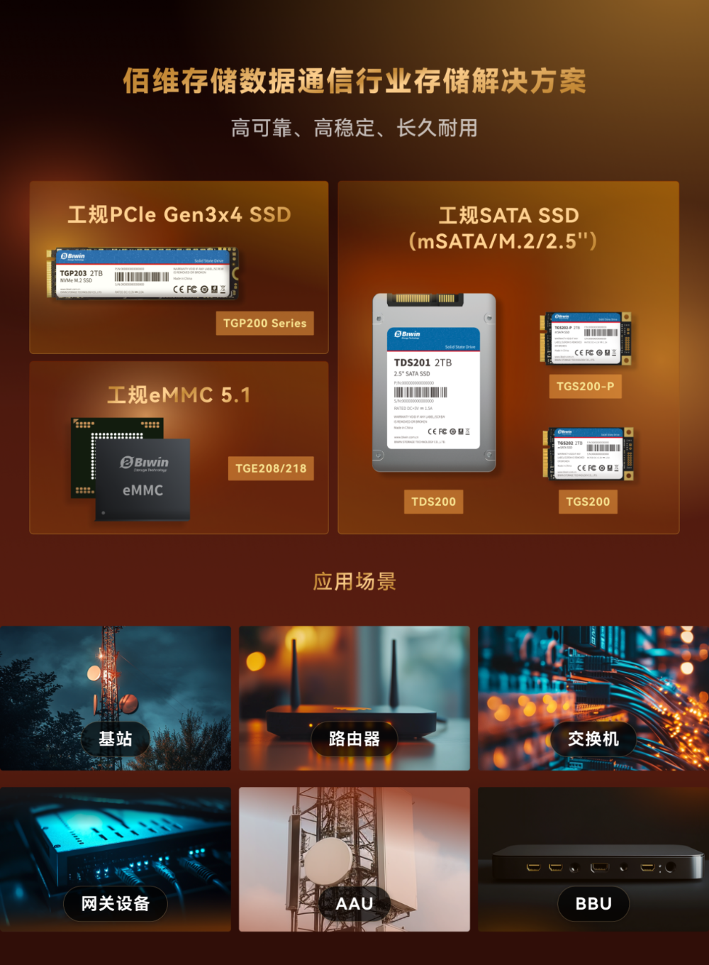 通信作为佰维存储的重要目标市场,存在怎样的挑战?在盛维看来,主要有四个方面:一是设备部署环境复杂,包括电源稳定性、高温、高湿、高污染等恶劣环境;二是设备维护困难,有的设备部署在偏远地区,发生故障的维护成本高;三是设备生命周期长,考验存储的长期稳定性;四是平台和系统兼容难,通信头部企业往往采用自研SoC和经过特殊设计的OS,考验存储的兼容性。