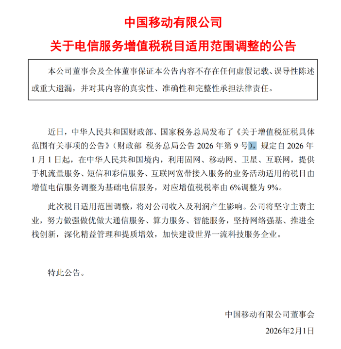 2月1日,中国移动、中国电信及中国联通三大电信运营商相继发布了《关于增值税征税具体范围有关事项的公告》(财政部 税务总局公告2026年第9号,以下简称《公告》)。《公告》规定自2026年1月1日起,在中华人民共和国境内,利用固网、移动网、卫星、互联网,提供手机流量服务、短信和彩信服务、互联网宽带接入服务的业务活动适用的税目由增值电信服务调整为基础电信服务,对应增值税税率由6%调整为9%。