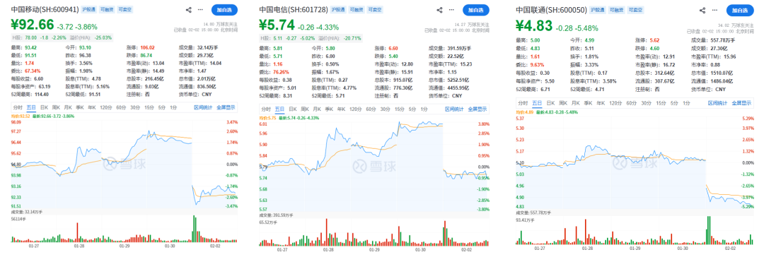 今日资本市场以脚投票,三大运营商全线走低。截至收盘,A股方面,中国移动跌3.86%,中国电信跌4.33%,中国联通跌5.48%;港股方面,中国移动跌2.66%,中国电信跌5.02%,中国联通跌6.29%。板块跌幅显著跑输大盘,反映投资者对利润侵蚀的深度担忧。