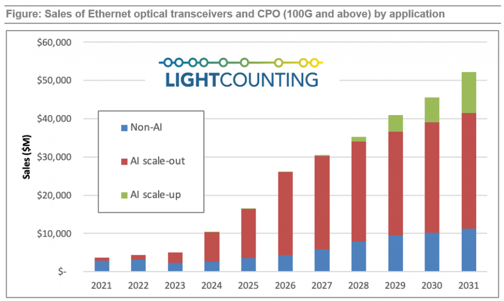 C114讯 2月3日消息(水易)近日,光通信行业市场研究机构LightCounting在最新的市场报告中写道,下图展示了对用于AI集群的以太网光模块(从100G起)以及CPO的销售预测,并将其与非AI应用场景进行对比,预计该市场规模在2025年达到165亿美元,并将在2026年增长至260亿美元。这相当于2025年和2026年均实现60%的同比增长。
