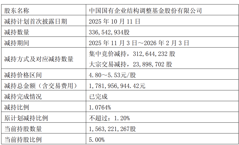 根据公告,结构调整基金于2025年10月11日披露减持计划,拟在三个交易月内通过集中竞价和大宗交易方式减持不超过375,173,104股(占总股本1.20%)。截至2026年2月3日,该减持计划已实施完毕。