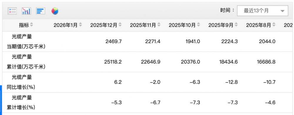 C114讯 2月4日消息(水易)国家统计局数据显示,2025年,国内光缆产量累计达到2.51亿芯千米,光缆产量累计下降5.3%。相较2024年光缆产量累计下降18.2%的数字,2025年虽仍在下降,但降幅大幅收窄。另外,2025年12年,光缆产量同比增长6.2%,环比增长8.7%。