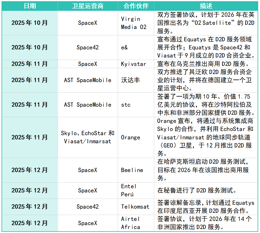 在2025年第四季度,卫星运营商加速了其D2D服务的扩张。表1总结了与商用发布、测试和合作伙伴关系相关的关键公告信息。