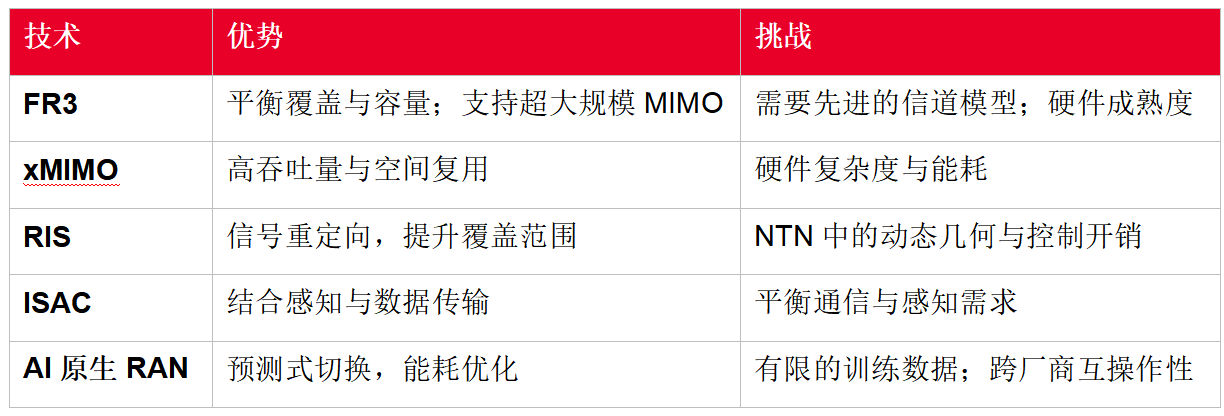 这些技术共同构成了智能化、自适应、由NTN赋能的6G生态系统的基石。不过,每项技术也都具备其独特优势与挑战(见表1)。
