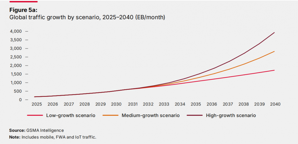 报告预测,在最保守增长情景下,全球移动流量在2030-2040年间年均增长约10%,到2040年达到1700 EB/月;在最高增长情景下年均增长超过20%,2040年接近4000 EB/月。