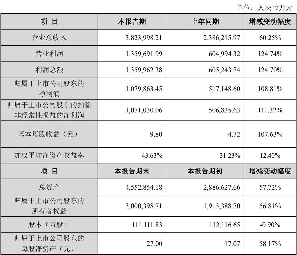 C114讯 2月28日消息(颜翊)昨日,中际旭创发布2025年度业绩快报。报告显示,公司全年实现营业总收入382.40亿元,同比增长60.25%;归属于上市公司股东的净利润为107.99亿元,同比大幅增长108.81%;扣除非经常性损益后的净利润为107.10亿元,同比增长111.32%。