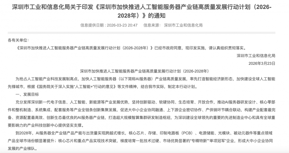 C114讯 3月25日消息(九九)深圳市工业和信息化局印发关于《深圳市加快推进人工智能服务器产业链高质量发展行动计划(2026-2028年)》的通知。