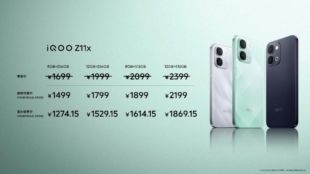 C114讯 3月26日消息(水易)今日,iQOO Z11系列正式发布并已全渠道开售,iQOO Z11首销补贴到手价1999元起,iQOO Z11x首销补贴到手价1499元起。