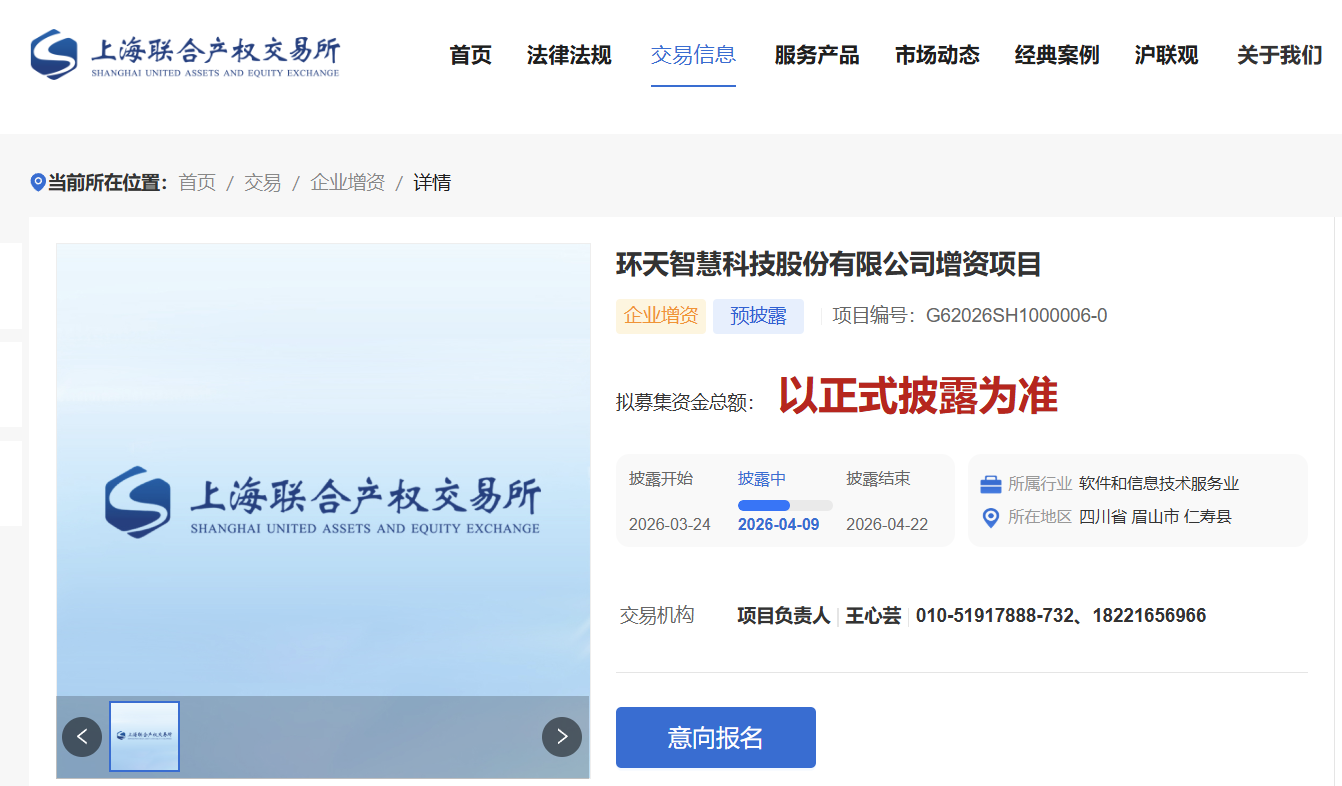 C114讯 4月9日消息(颜翊)日前,环天智慧科技股份有限公司(以下简称“环天智慧”)在上海联合产权交易所发布增资项目公告,拟通过公开挂牌方式引入战略投资者。