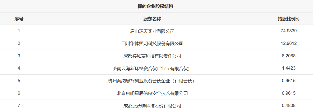 根据挂牌信息,环天智慧成立于2020年4月,注册资本1.2亿元,法定代表人为邹云坤,注册地位于四川省眉山市仁寿县。公司属于国有实际控制企业。此次增资前,眉山环天实业有限公司为控股股东,持股比例高达74.98%;四川华体照明科技股份有限公司、成都裳和宸科技有限责任公司、北京启明星辰信息安全技术有限公司等为重要股东。