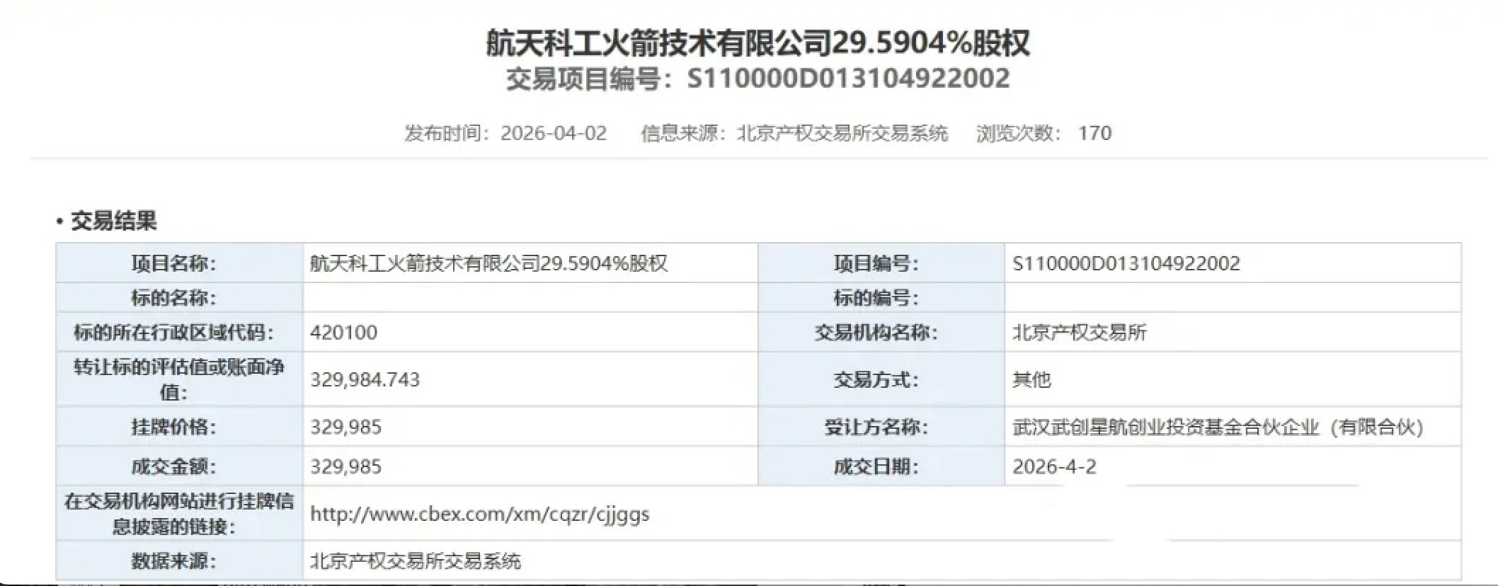 C114讯 4月13日消息(南山)据武汉投控集团发布消息,该集团通过其牵头组建的武汉武创星航创业投资基金,成功摘牌受让中国航天三江集团有限公司持有的航天科工火箭技术有限公司(以下简称“科工火箭”)29.5904%股权,成交金额32.9985亿元。