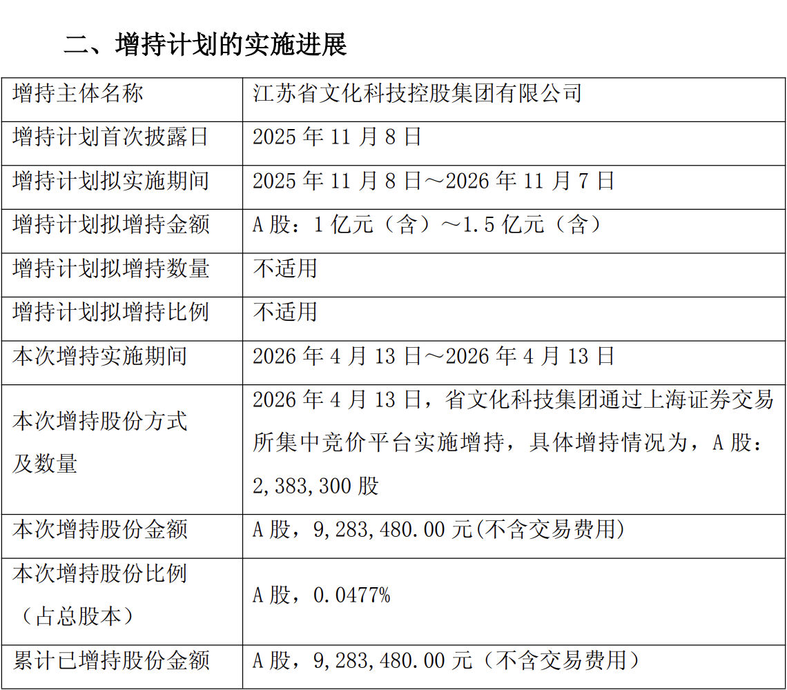 公告显示,2026年4月13日,省文化科技集团通过上海证券交易所系统以集中竞价交易方式增持公司股份2,383,300股,占公司目前总股本的0.0477%。本次增持金额为9,283,480.00元(不含交易费用)。
