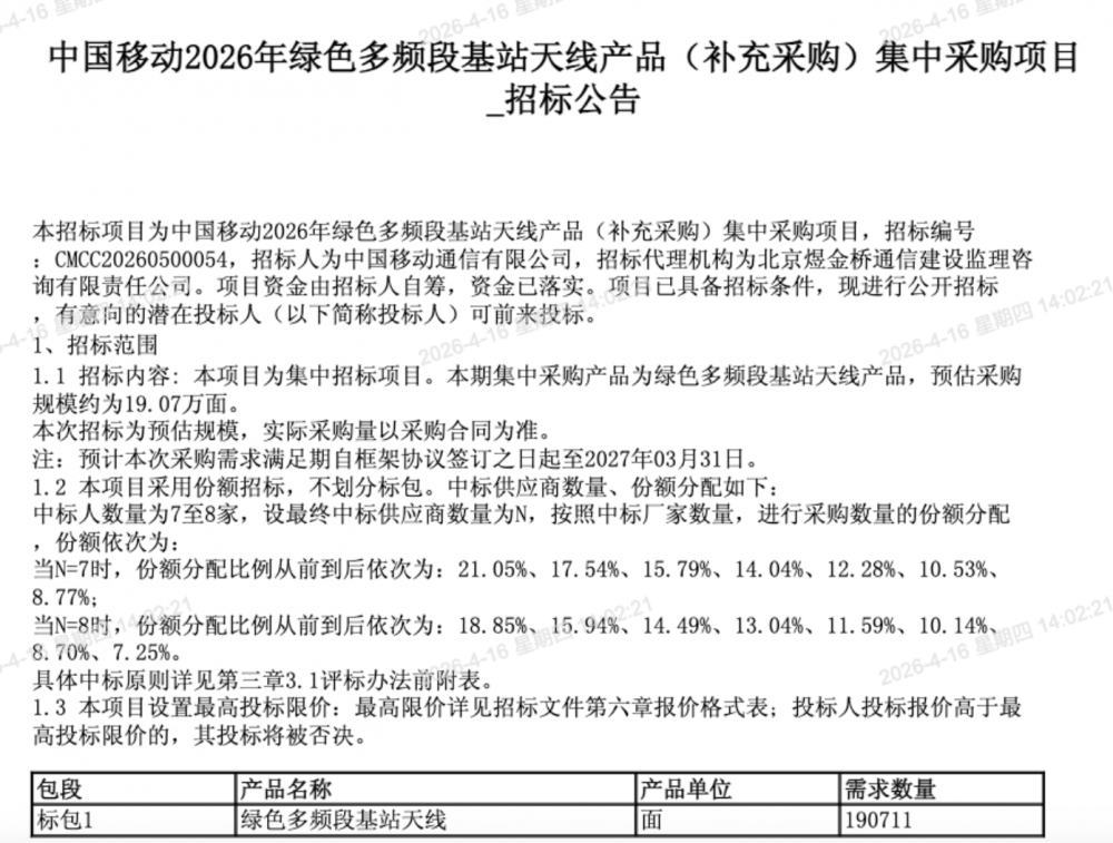 C114讯 4月16日消息(九九)中国移动采购与招标网日前发布2026年绿色多频段基站天线产品(补充采购)集中采购项目招标公告。本期集中采购产品为绿色多频段基站天线,预估采购规模约为19.07万面。