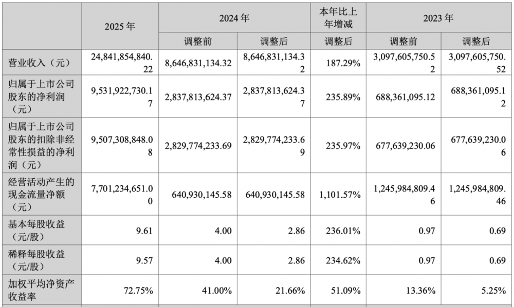 C114讯 4月24日消息(水易)昨日,新易盛公布2025年业绩。报告期内,新易盛实现营收248.42亿元,同比增长187.29%;归属于母公司股东的净利润95.32亿元,同比增长235.89%;扣非净利润95.07亿元,同比增长235.97%.