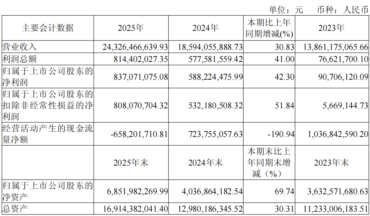 截至2025年末,公司总资产达169.14亿元,较上年末增长30.31%;归属于上市公司股东的所有者权益为68.52亿元,同比增长69.74%,主要系向特定对象发行股票募集资金,同时随着公司经营规模扩张,存货等流动资产增加所致。