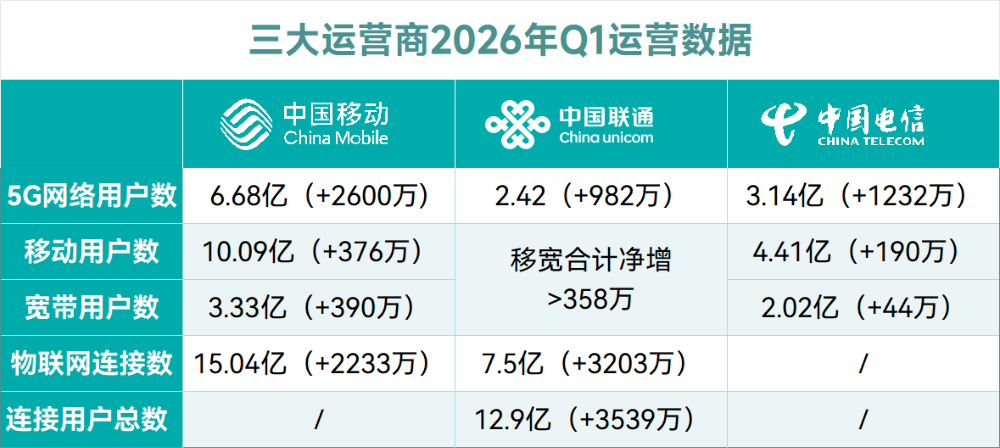 综合来看,传统连接市场已高度饱和。工信部最新数据显示,截至2026年3月末,全行业移动电话用户总数达18.36亿户,季度净增仅920.1万户。在庞大基数下,用户规模扩张的红利基本见顶,单纯依靠新增用户拉动收入的增长模式难以为继。运营商必须寻找新的价值锚点。