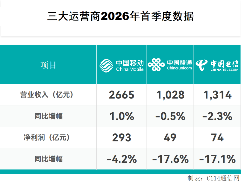 C114讯 4月24日消息(颜翊)2026年第一季度,通信行业迎来了一场罕见的“倒春寒”。