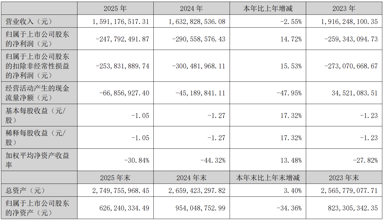 截至2025年末,公司总资产27.50亿元,同比增长3.40%;归属于上市公司股东的净资产6.26亿元,较上年末下降34.36%。