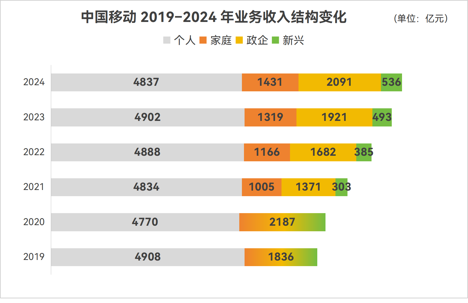 在新兴市场也就是在N端,中国移动同样在2021年年报中开始进行数据披露,是年收入为303亿元,收入占比为3.57%;到了2024年,新兴业务收入为536亿元,收入占比增长至5.15%。