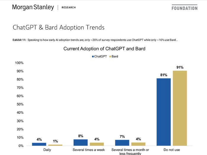 据摩根士丹利的一项调查显示,人工智能聊天机器人的使用率远低于人们的想象。