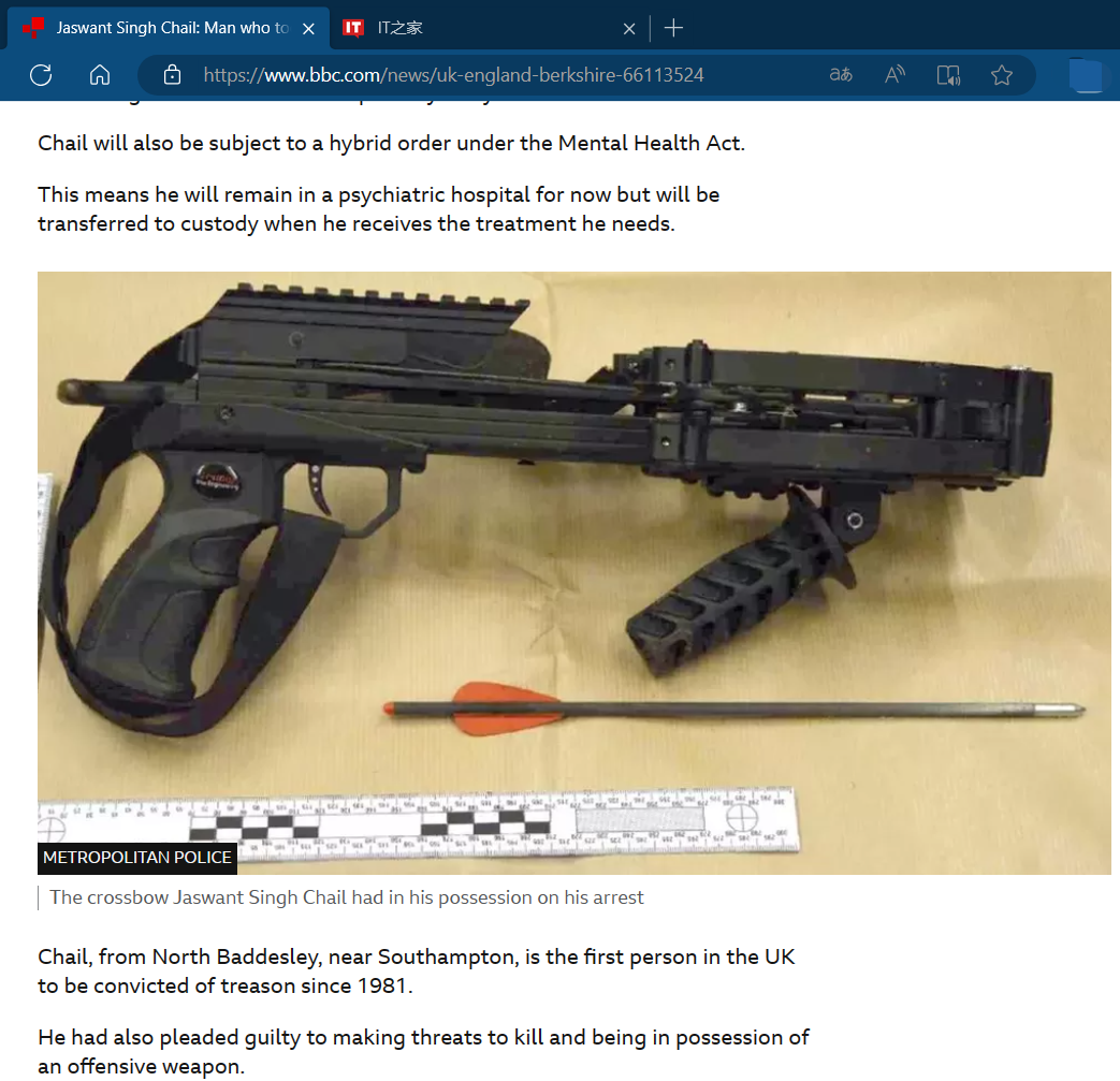 据英国 BBC 报道,2021 年圣诞节,一名手持弩枪的男子计划暗杀英国女王,在温莎城堡被捕,如今他因叛国罪被判入狱九年。