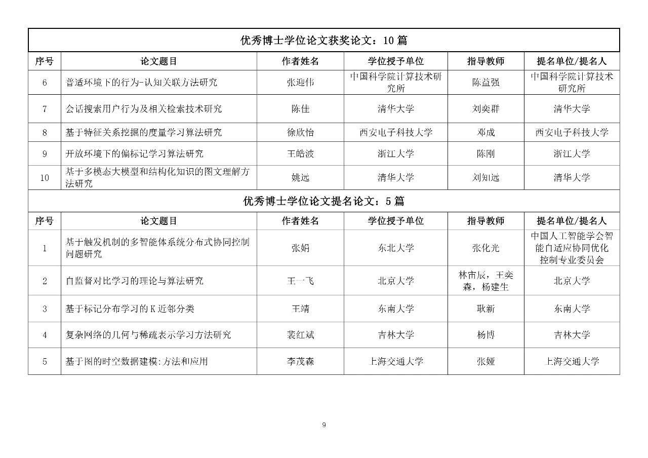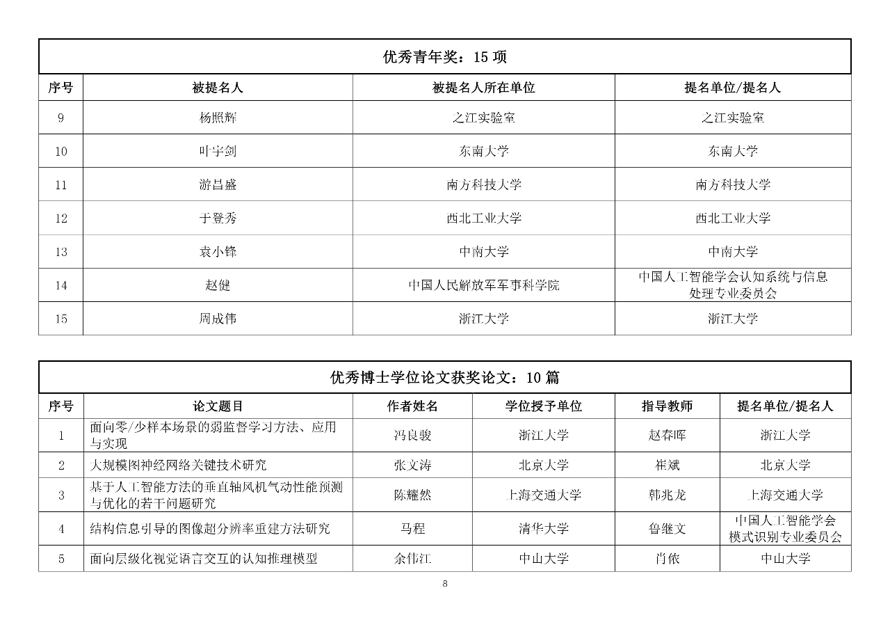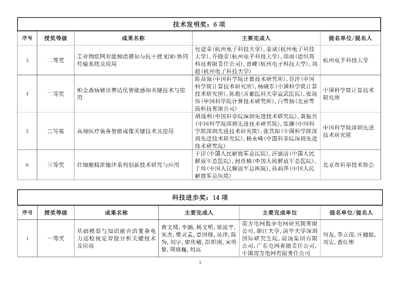 2023年度吴文俊人工智能最高成就奖1项;杰出贡献奖3项;自然科学奖一等奖3项、二等奖3项;技术发明奖一等奖2项、二等奖3项、三等奖1项;科技进步奖一等奖3项、二等奖6项、三等奖5项;专项奖(芯片项目)一等奖1项、二等奖1项;科技进步奖(科普项目)4项;科技进步奖(企业技术创新工程项目)4项;优秀青年奖15项;优秀博士学位论文获奖论文10篇、提名论文5篇。