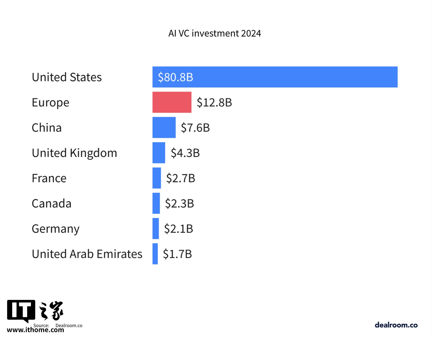 从 Dealroom 的数据来看,AI 企业在非美国市场的资金支持相对薄弱。2024 年,美国 AI 初创企业共筹集了 807 亿美元,占美国风险投资总额的 42%;而欧洲仅为 128 亿美元,占比 25%;其余地区的占比仅为 18%。中国在 2024 年表现突出,共获得 76 亿美元的投资。