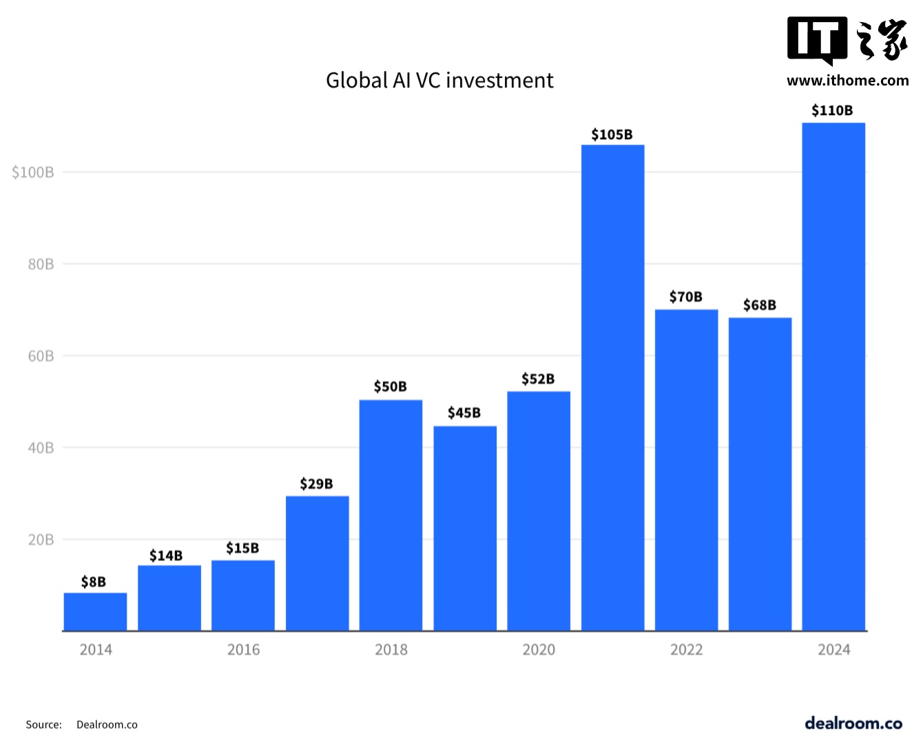据数据分析公司 Dealroom 的最新报告显示,人工智能(AI)初创企业在 2024 年共筹集了 1100 亿美元(IT之家备注:当前约 8038.59 亿元人民币)的资金,较上一年增长了 62%。然而,与此同时,整个科技领域的初创企业和成长型企业(包括非 AI 领域)在 2024 年共筹集了 2270 亿美元,较 2023 年下降了 12%。这表明,尽管科技行业整体投资有所下滑,但 AI 领域的投资热潮却逆势上扬,成为资本追逐的焦点。
