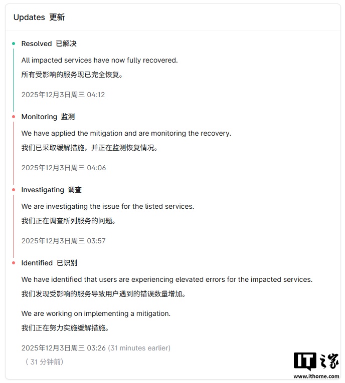 查询 OpenAI 官方状态页面,发现 12 月 2 日和 12 月 3 日均出现了状态不稳定情况。第一次故障于北京时间 12 月 2 日 2 点 08 分出现问题,并已于当天 2 点 37 分采取缓解措施,并正在监测恢复情况;于 3 点确认已完全恢复。IT之家附上相关截图如下: