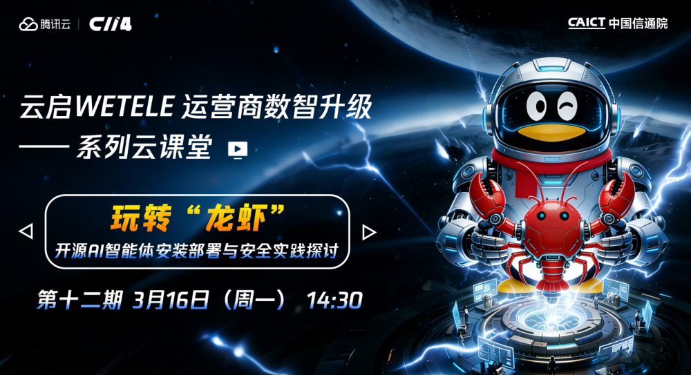 C114讯 3月18日消息(南山)3月16日,由腾讯云携手中国信息通信研究院云计算与数字化研究所、C114通信网打造的“云启WETELE运营商数智升级”系列在线课堂,2026年第一期(总第十二期)正式开讲。本期课堂的主题是探讨当前最火热的AI智能体OpenClaw(昵称“龙虾”)。
