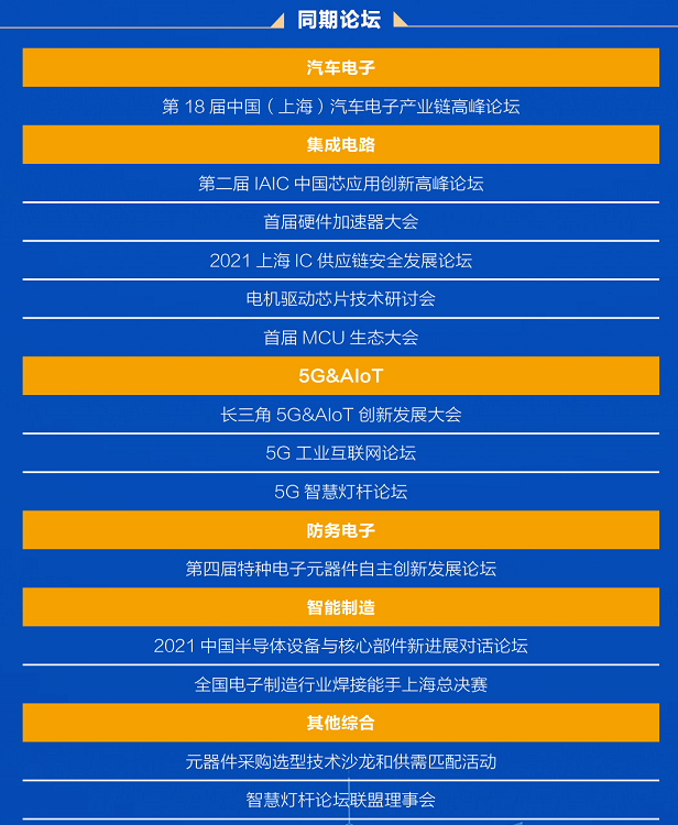 论坛聚焦电子元器件、集成电路、5G&AIoT、防务电子、汽车电子和智能制造等重点领域,以电子信息产业发展为基石,吸纳行业顶尖力量,汇集多样化市场技术方案,为行业发展提供精准资源,探索前进方向。除了极具专业性的高端论坛,富含趣味性与互动性的全国电子制造行业焊接能手上海总决赛、元器件采购选型技术沙龙和供需匹配活动和《本土MCU新锐十强》排行榜发布等丰富配套活动也将在展会期间与观众热情见面,燃爆会场。