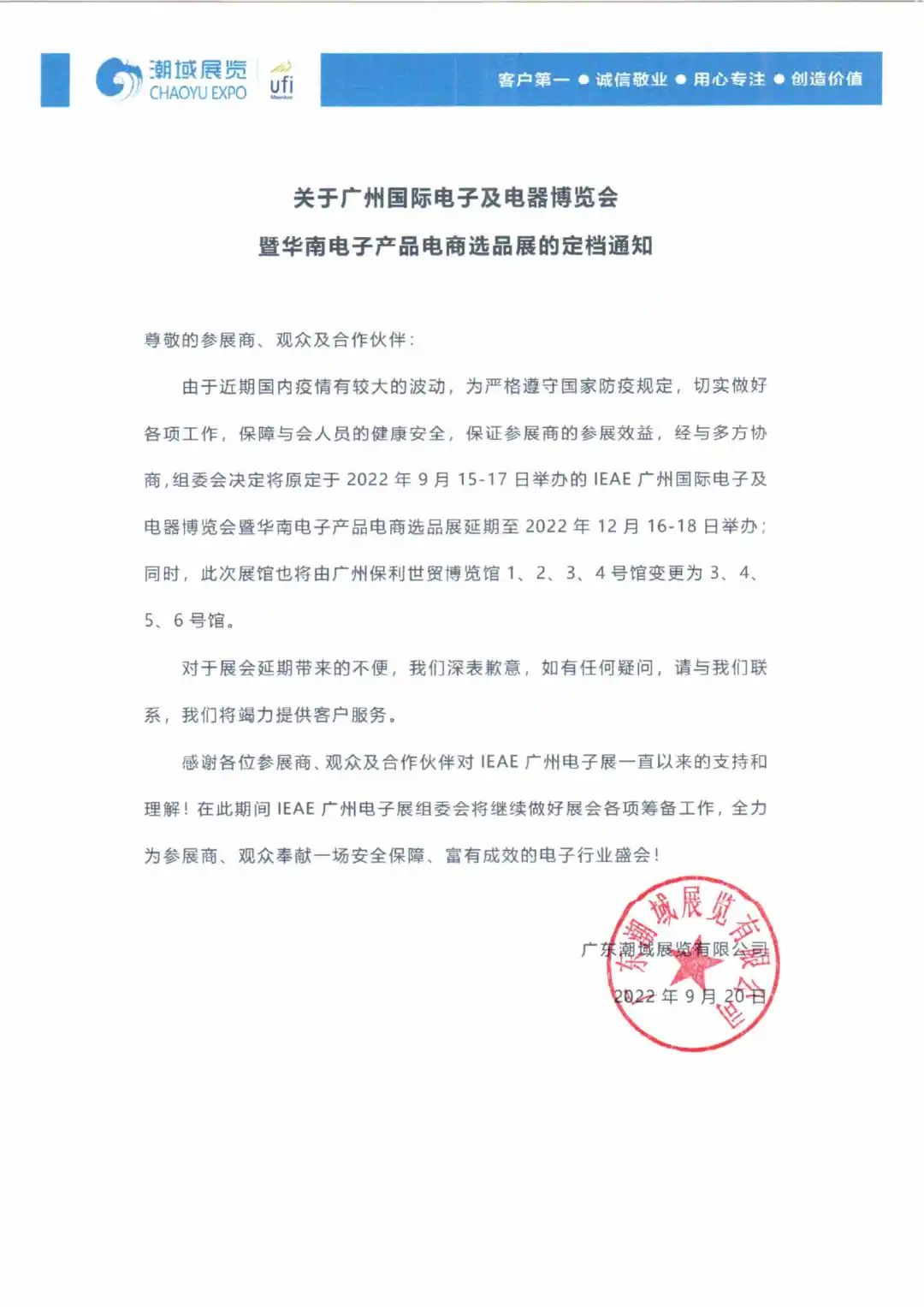 由于近期国内疫情有较大的波动,为严格遵守国家防疫规定,切实做好各项工作,保障与会人员的健康安全,保证参展商的参展效益,经与多方协商,组委会决定将原定于2022年9月15-17日举办的IEAE广州国际电子及电器博览会暨华南电子产品电商选品展延期至2022年12月16-18日举办;同时,此次展馆也将由广州保利世贸博览馆1、2、3、4号馆变更为3、4、5、6号馆。