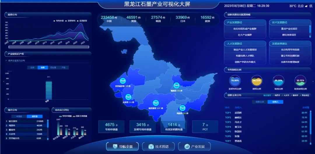 以知识产权信息和区域知识产权数据和产业数据为基础,集成和管理专利和商标创造运用相关数据,建设数据实时更新、动态展示的知识产权数据大屏,便于政府及相关管理部门直观掌握区域知识产权关键数据指标及特色创新指标;定制化开发基于重点产业的专利导航数据可视化展示,绘制区域重点产业创新图谱,助力区域重点产业及中小企业创新发展。